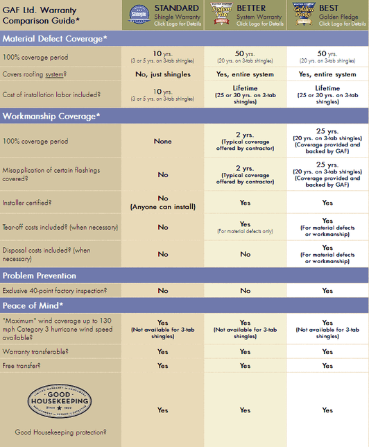 GAF offers you more warranty choices for your new roof. To help you select the right warranty, the chart below summarizes the key provisions of each of our GAF warranties.